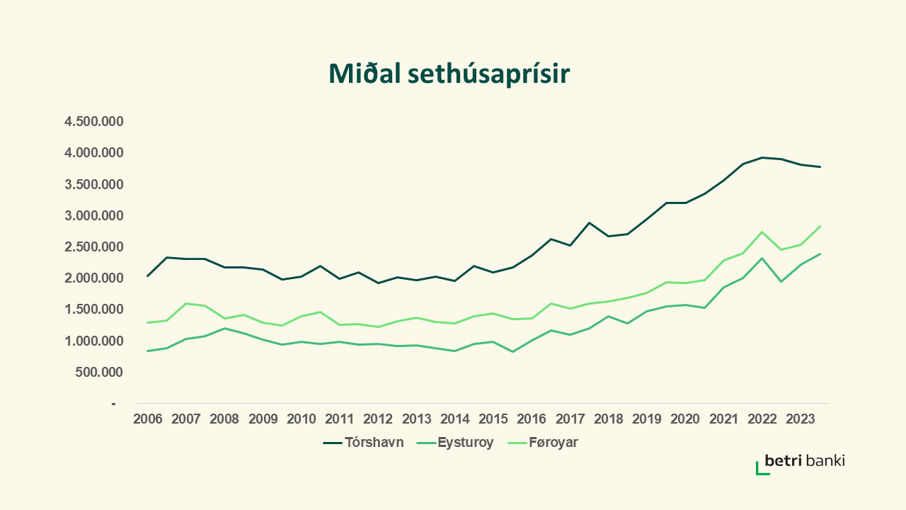 Vit kunnu nú staðfesta, at miðal sethúsaprísurin í Tórshavn lækkaði eitt vet í 2023, í mun til í 2022. Samstundis hækkaði miðalprísurin í Eysturoynni og samlað fyri alt landið.